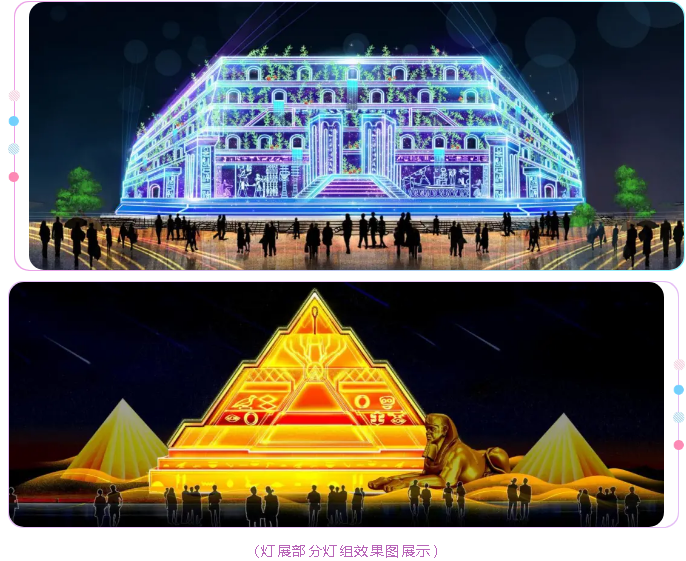 由自貢燈貿集團股份有限公司承制的“桔橙光影 大雅丹棱”燈光節(jié),以“北緯30度,世界最神奇的存在”為主線,情景展開這一緯度上的奇觀絕景和神秘文化。精湛的彩燈工藝和現(xiàn)代光影技術,散發(fā)著異乎尋常和夢幻的光影色彩,為游人展示北緯30度各國的文化表情和最璀璨的古老文明。